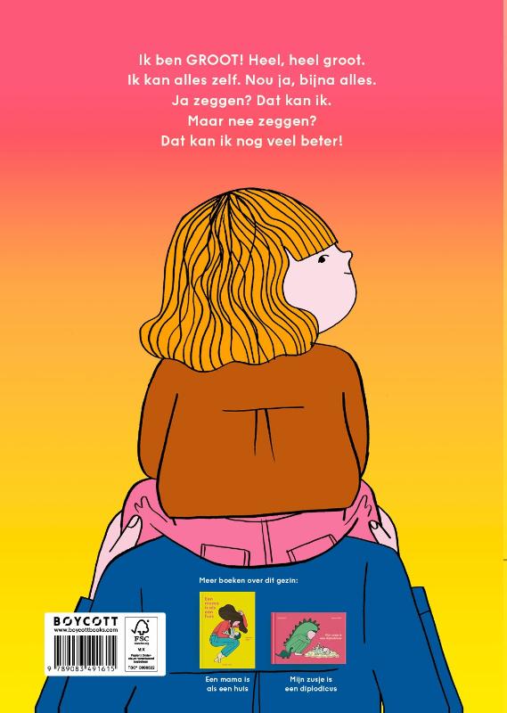 Dat ben ik. Ik ben groot. Ik kan tellen. Ik heb 1 navel, 2 benen, 2 oren en ik ben 2 jaar oud! Kleine meisjes worden groot. Met een liefdevolle blik beschrijft Aurore Petit dat delicate moment waarop kinderen zelfstandiger worden en steeds verder de grenzen verleggen om de wereld om hen heen te verkennen. Het zelfbewustzijn, de drang om zich te verzetten en de bevestiging van haar eigen capaciteiten en persoonlijkheid, zorgen ervoor dat het kleine meisje haar plek in de wereld opeist. Eerder verschenen in deze serie de hartverwarmende titels 'Een mama is als een huis' en 'Mijn zusje is een diplodocus'. Aurore Petit weet het leven van een moeder en haar kinderen op intieme wijze vast te leggen in deze kronieken.